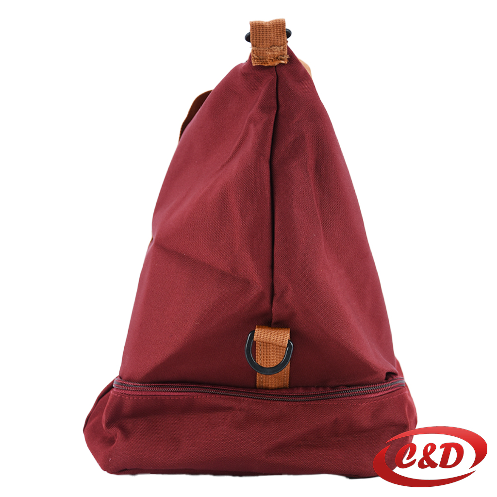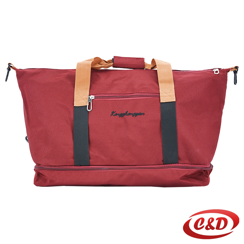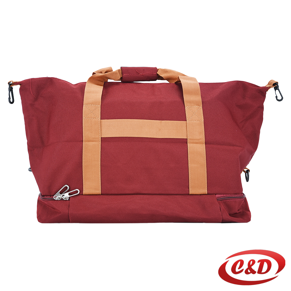 Moderna i praktična bordo putna torba s kontrastnim bež ručkama. Donji pretinac omogućava odvajanje obuće ili dodatnih stvari.